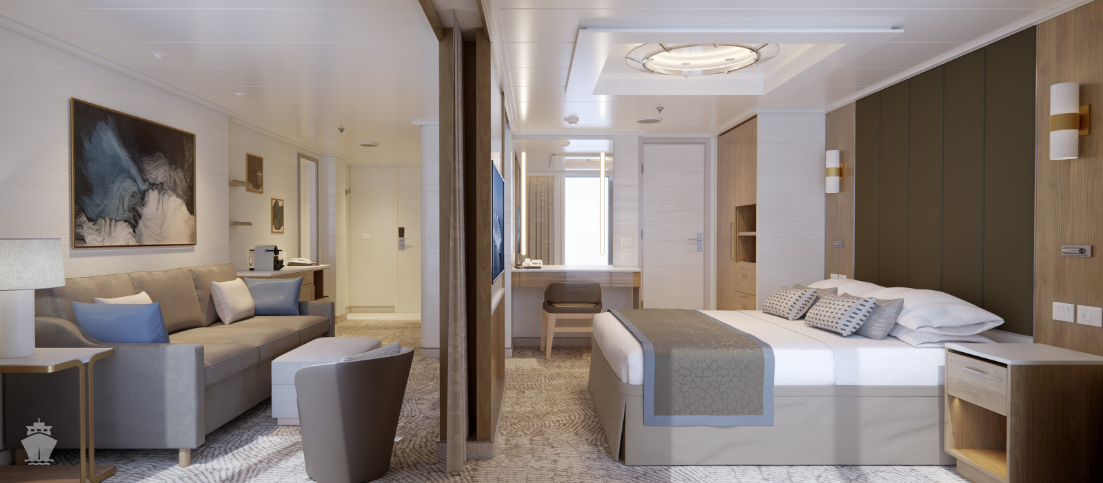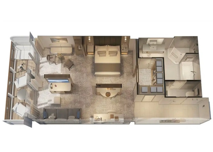S2 - Signature Owner Suite 53 m² + 7 m² balkón. 10. paluba stred,16. vpredu. Max 4 osoby. Výhody Signature Suite. 13 572 € 6 786 € za osobu
