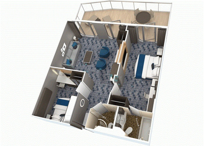 A2 - AquaTheatre Suite s balkónom / 2 spálne 62,5 m² + balkón 56 m². 9,10. paluba vzadu. Max 8 osôb. Výhody Royal Suite Star Class. 9 524 € 4 762 € za osobu