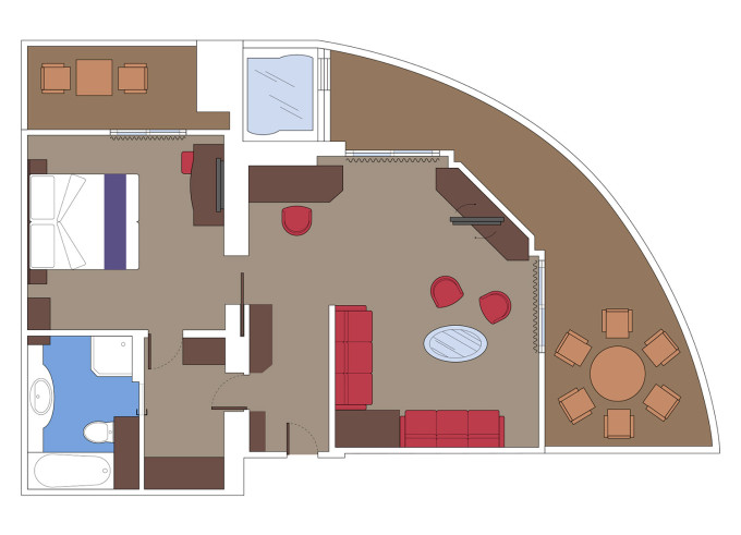 YC3 - Yacht Club Royal Suite s vírivkou 58 m² + rohový balkón s vírivkou 70 m². Oddelená obývacia časť a spálňa, šatník, kúpeľňa s vaňou a sprchou. 15. paluba. Cenový model MSC Yacht Club. | 12 354 € 4 118 € za osobu |