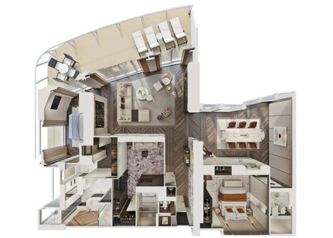H2 - The Haven Deluxe Owner's Suite 197 m² / balkón 45 m². 18. paluba vpredu. Max 6 osôb. Výhody The Haven. | 7 448 € 3 724 € za osobu |