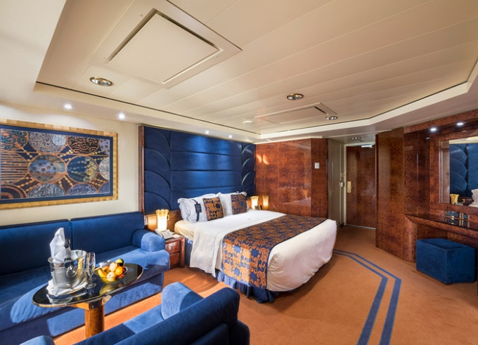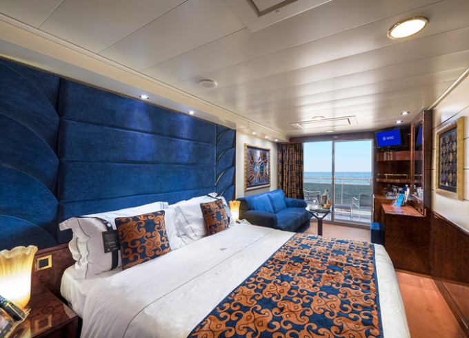 Suite s balkónom/panoramatickým oknom: 21-47m², (Royal 53m², Family 52m²)kajuta s manželskou posteľou (na požiadanie 2 oddelené postele) a rozkladacia pohovka. Klimatizácia, kúpeľňa s vaňou, toaletný stolík, priestorná skriňa, interaktívna TV, telefón, minibar, sejf, sušič na vlasy. Balkón so stolíkom a stoličkami/panoramatické okno. Internetové pripojenie (za poplatok).
