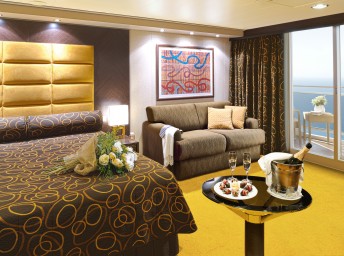 Suite s balkónom/panoramatickým oknom: cca32m²(Royal suite: 52m², Family suite: 45-53m², Deluxe Suite: 32-39m², Aurea suite: 21-47m²), kajuta s manželskou posteľou (na požiadanie 2 oddelené postele) a rozkladacia pohovka. Klimatizácia, kúpeľňa s vaňou, toaletný stolík, priestorná skriňa, interaktívna TV, telefón, minibar, sejf, sušič na vlasy. Balkón so stolíkom a stoličkami/panoramatickým oknom. Internetové pripojenie (za poplatok).
