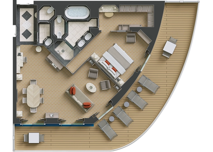O2 - Owner's Suite 2 119 - 129 m² (vrátane balkóna 12 m²). Owners Suite S1 spojená s Panorama Suite PA 9. paluba - stred. Max 5 osôb. | 69 000 € 34 500 € za osobu |