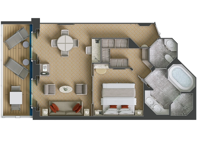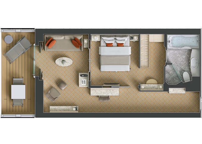 DX - Deluxe Veranda Suite 30 m² + balkón 6 m². 6,7,8. paluba - stred. Max 3 osoby. | 19 775 € 19 775 € za osobu | ||