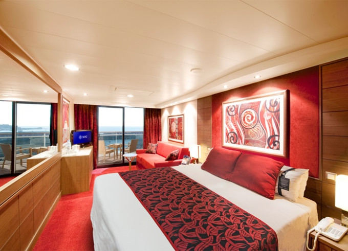 Suite s balkónom: cca 31m² kajuta s manželskou posteľou (na požiadanie 2 oddelené postele) a rozkladacia pohovka. Klimatizácia, kúpeľňa s vaňou, toaletný stolík, priestorná skriňa, interaktívna TV, telefón, minibar, sejf, sušič na vlasy. Balkón so stolíkom a stoličkami. Internetové pripojenie (za poplatok).