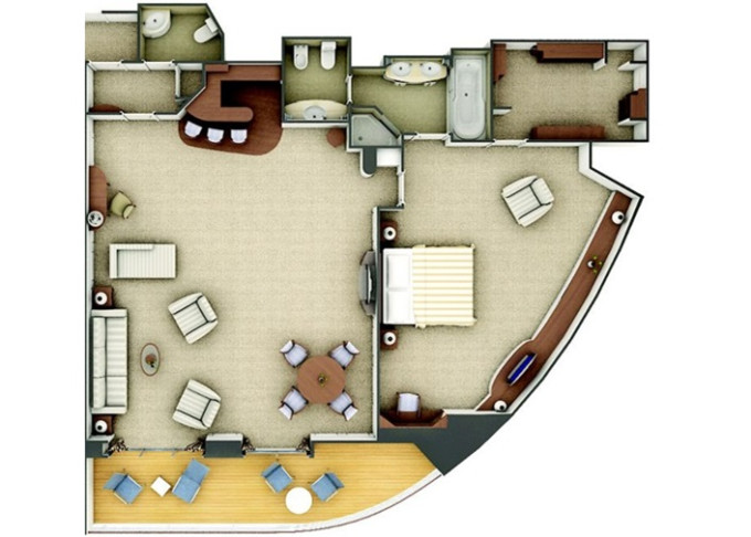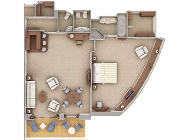 O2 - Owner's Suite 2 117 m² (vrátane balkóna 20 m²). Owners Suite O1 spojená s Vista Suite. 7. paluba stred. Max 5 osôb. 237 600 € 59 400 € za osobu