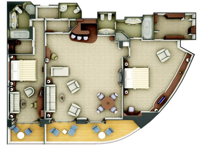 R2 - Royal Suite 2 122-126 m² (vrátane balkónov 16-17 m²). Royal Suite prepojená s Veranda Suite. 6,7. paluba vpredu. Max 3 osoby. 218 800 € 54 700 € za osobu