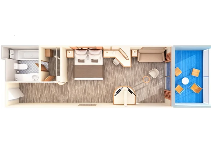 8M - Kajuta s väčším balkónom Aft-View 21,5 - 25,5 m² (vrátane balkóna). 8, 9, 10. paluba vzadu. | 2 190 € 1 095 € za osobu |