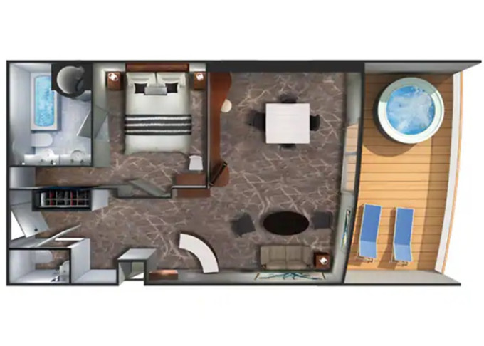 SD - Aft-facing Penthouse 52-54 m² / balkón 18 m². 8. až 0. paluba - vzadu. Max 4 osoby. Výhody Suite. | 44 702 € 22 351 € za osobu | ||